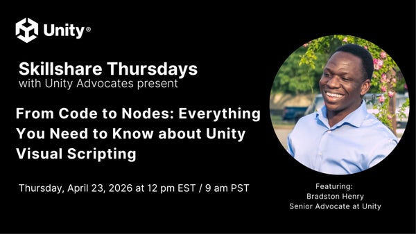In this Skillshare Thursday, we will be exploring Unity Visual Scripting and how to get started with it. We'll dive into what Unity Visual Scripting is, how to use it to do common Unity development tasks, and how to use it alongside traditional C# Scripting. By the end of this talk, you should have the confidence and knowledge to use Unity Visual Scripting in your personal and professional projects.